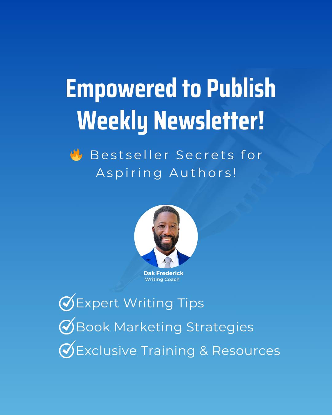 Receive Exclusive Training & Resources to help you become a Bestselling Author! Weekly tips & inspiraton: